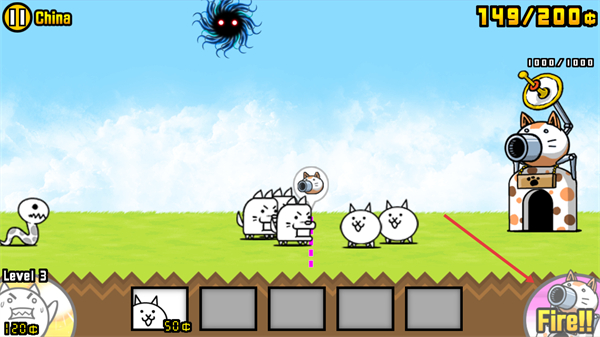 2、界面上方能量条攒满后,点击右侧Fire使用猫咪炮清理密集小怪。