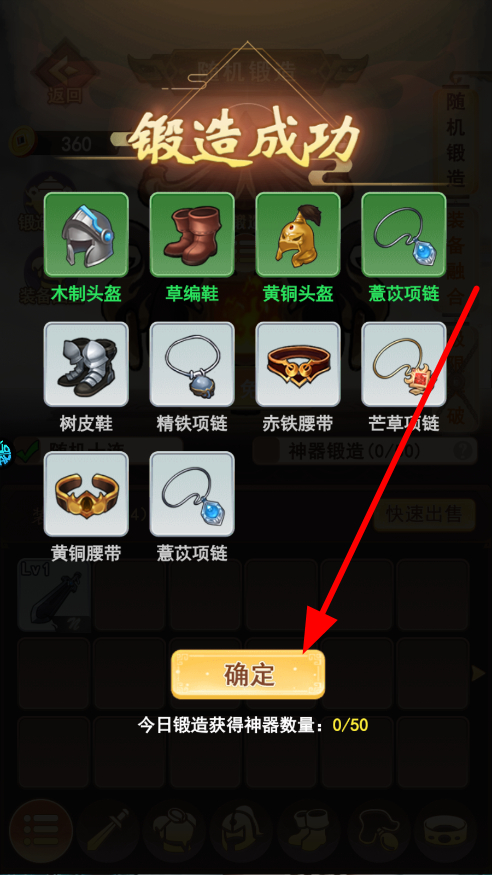 4、进行装备锻造,成功锻造出装备后,点击确定,让角色获得新装备,增强角色战力,在后续战斗与闯荡中更具优势。