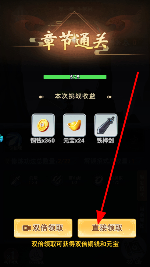 3、章节通关后,领取本次挑战的收益,其中包含铜钱、元宝、武器等奖励,可选择直接领取,用于提升角色或装备等方面。