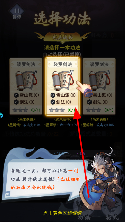 2、每通过一关,会进入功法选择,从提供的功法中挑选一本,所选功法能提升侠客属性,助力后续战斗,根据需求合理选择。
