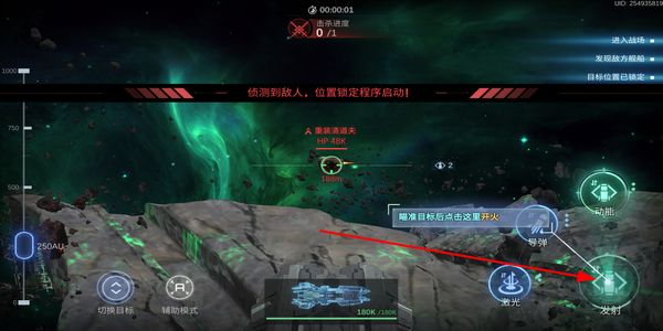 1、战斗场景中瞄准敌方目标,点击发射按钮发起攻击,消耗敌方单位的血量,推进当前战斗的击杀进度。