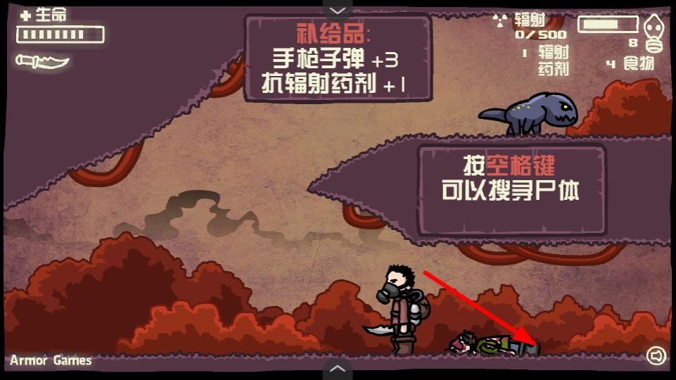 3、按空格键可搜寻尸体,获取手枪子弹、抗辐射药剂等补给品,提升生存战斗能力。