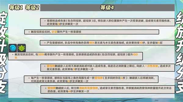 ①【绽放】50%概率触发绽放时额外产生1枚草原核,并提升150%草原核伤害。分支①,必产额外草原核,可进阶72%水草增伤,适合水草直伤体系;分支②,产出大量萦绕种,适合常规绽放体系。