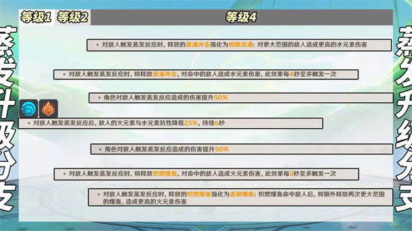 ②【蒸发】触发蒸发降低敌人25%水火抗性。分支①,浪涌冲击,协助挂水;分支②,炽燃爆轰,协助挂火。