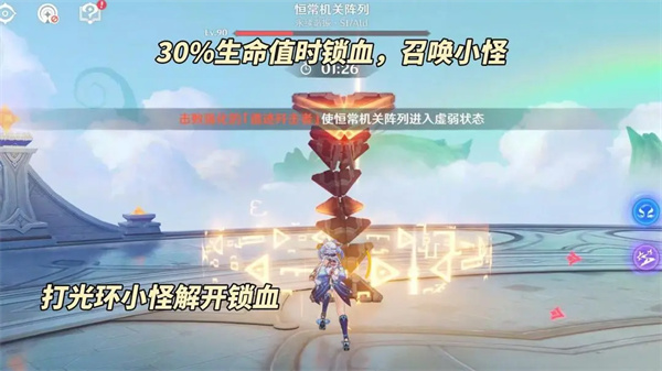 减少70%生命值时锁血并分裂小机关,消灭光环围绕指定机关后本体虚弱,此时可攻击且全抗降低50%,推荐对单较强的体系。