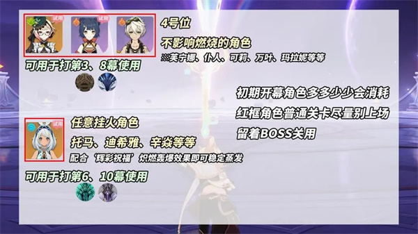 翻找好友列表,看是否有高命座的阿蕾奇诺、艾梅莉埃、那维莱特,本期挺好用!低配建议:第3、8幕使用,艾梅莉埃+班尼特+香菱+不影响燃烧的角色,激活燃烧荒火冲击+火柱;第6、10幕使用,玛拉妮+任意挂火角色,激活蒸发炽燃轰爆+蒸发反应提升50%。