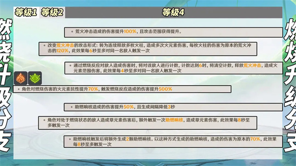 ③【燃烧】提升500%燃烧反应伤害与70%燃烧火抗。分支①,荒火冲击,协助挂火;分支②,助燃响核,协助挂草。