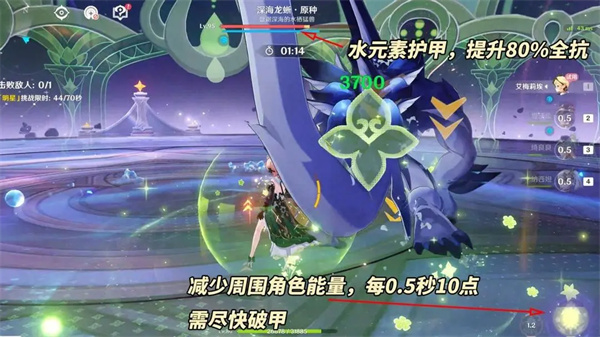 战斗中会生成16单位水元素护甲(深渊水法是12单位),全抗提升80%,并持续扣除周围角色能量(每0.5秒减10能量)。草元素可较快破除护甲,建议本期提供的艾梅莉埃、瑶瑶留一个做准备。
