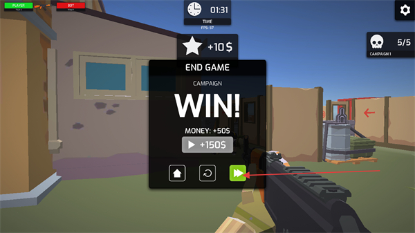 4、消灭指定数量敌人如5/5后,达成WIN!,获取金币奖励,可继续挑战新关卡。