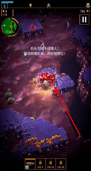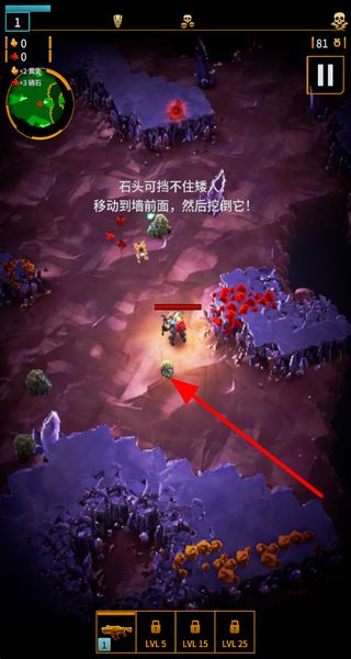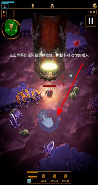 1、点击屏幕操控矮人移动,探索不同区域,躲避怪物和寻找资源,推进游戏的生存进度。