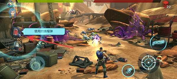 1、点击使用燃烧榴弹,可对范围内敌人造成火焰伤害,有效清理密集敌群。