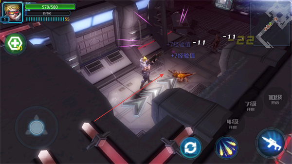 2、使用武器攻击靠近的僵尸,击败后获取7级经验值,积累经验提升等级,增强战斗能力。