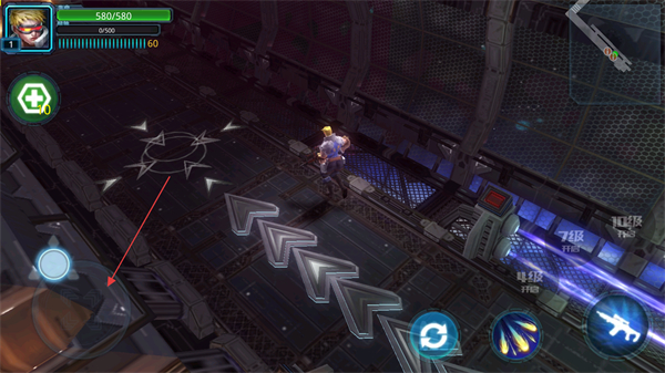 1、操控角色移动至星形区域,利用场景掩体躲避,准备应对僵尸突袭,保持血量与能量稳定。