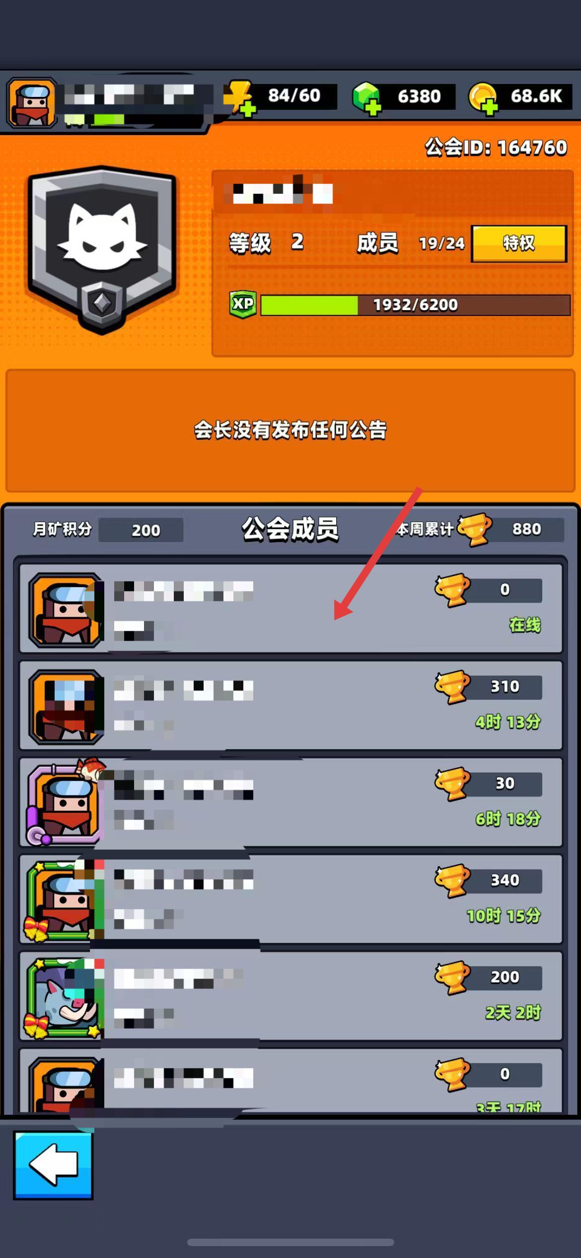 3、在公会详情页面,找到并点击自己的角色信息。