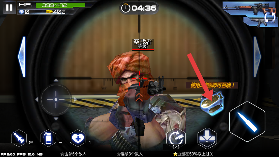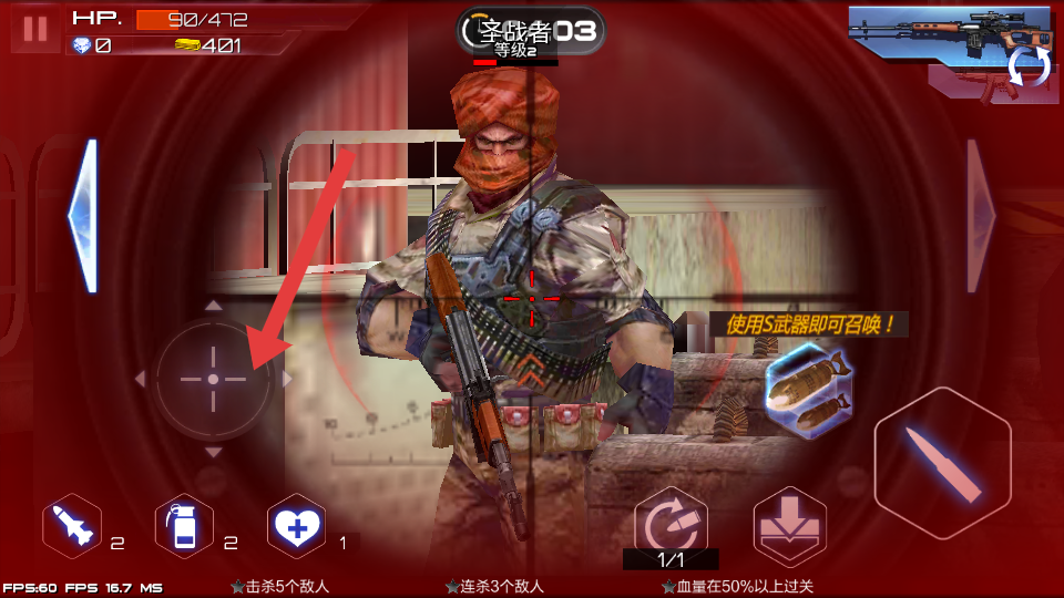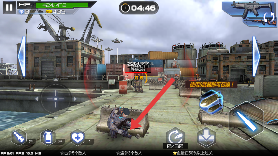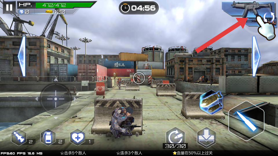 1、战斗时,点击箭头指向的武器切换区域,根据战场情况,选择合适的枪械,提升战斗效率,应对不同类型的敌人。