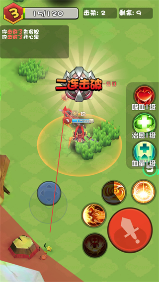 4、升级时选择技能如吸血、治愈、血量升级,增强自身战力,达成二连击破等成就,持续消灭敌人,成为乱斗王者。