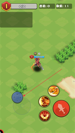 1、通过左侧虚拟摇杆控制角色移动,在地图中探索,寻找敌人。