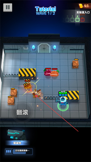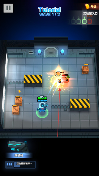 2、操控角色移动,用爆裂枪自动攻击敌人,清理实验室中的怪物。