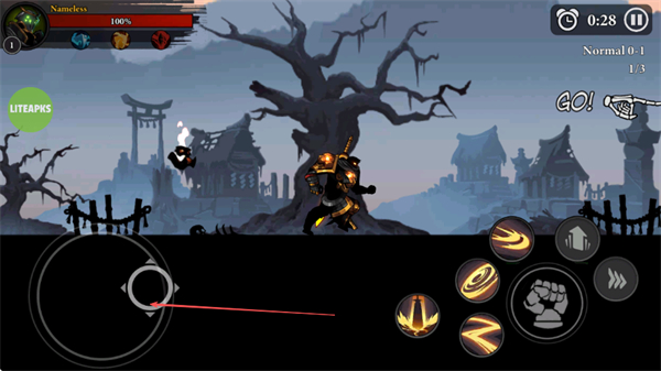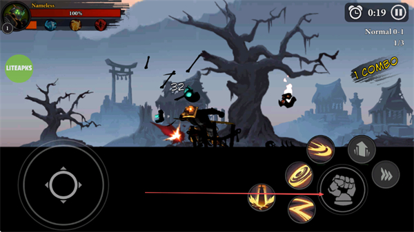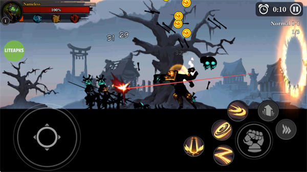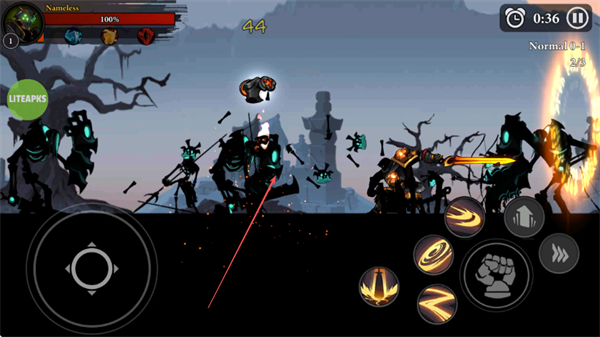 1、通过左侧虚拟摇杆控制火柴人移动,右侧按键执行攻击、技能释放等操作,在关卡中与敌人战斗。