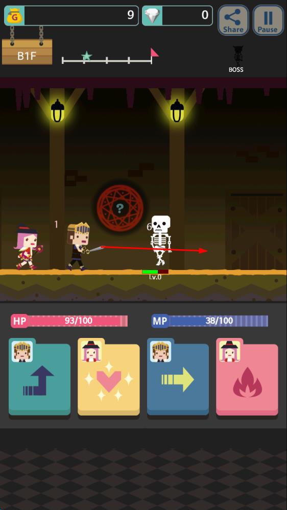 2、在地牢 B1F 层,操控角色与骷髅怪物战斗,利用下方技能卡片,合理释放技能,消耗怪物血量 。