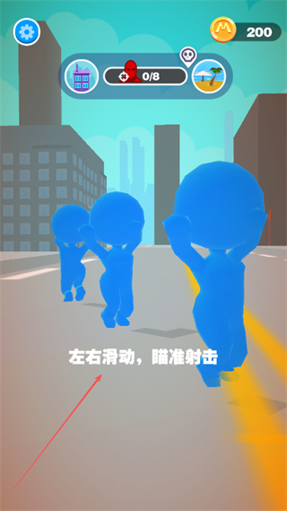 1、左右滑动屏幕瞄准蓝色小人,练习射击操作,熟悉瞄准机制。