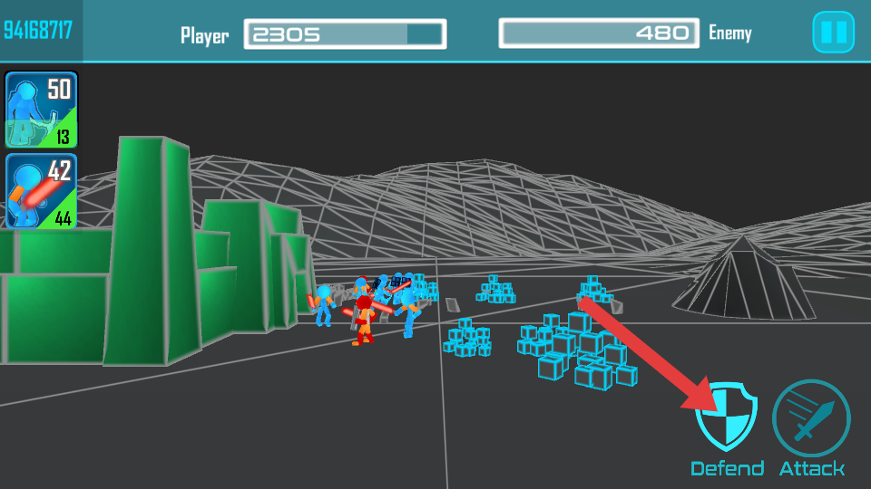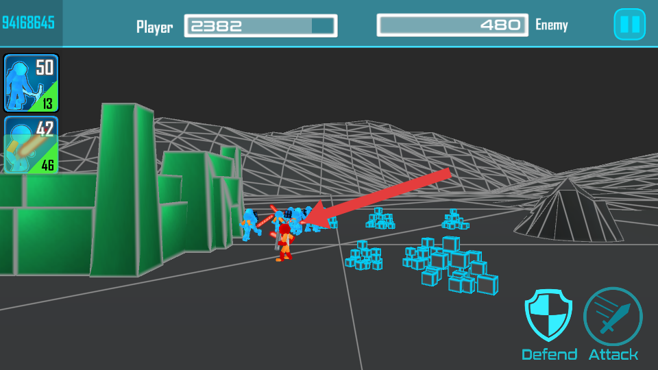 4、在战斗过程中,若敌人发起强势攻击,点击箭头指向的Defend防御按钮,让己方单位进入防御状态,减少受到的伤害。