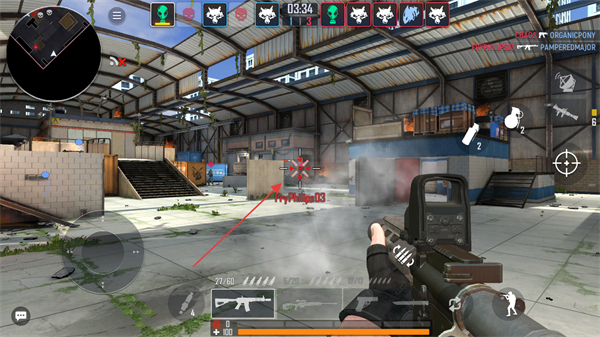 2、在仓库场景中,用虚拟摇杆移动,瞄准敌方角色发起攻击。