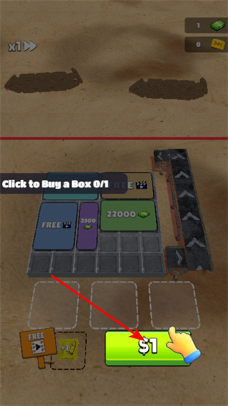 4、点击绿色的$1按钮购买箱子,完成“Click to Buy a Box0/1”任务,通过不断购买和布局箱子来推进游戏进程。