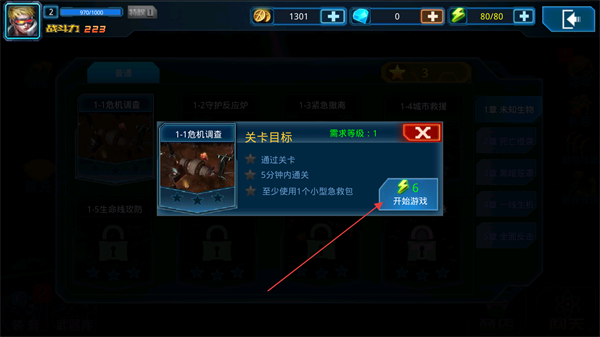 1、查看1-1危机通讯的关卡目标,点击开始游戏进入关卡,需5分钟内通关并使用急救包。
