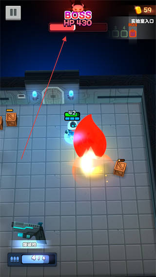 1、面对BOSS时,利用翻滚技能躲避攻击,同时用爆裂枪持续输出,削减其HP。
