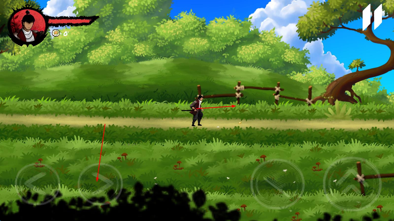2、在草地场景,通过左下角方向按键,操控武士向右移动,探索沿途的环境与可能出现的状况。