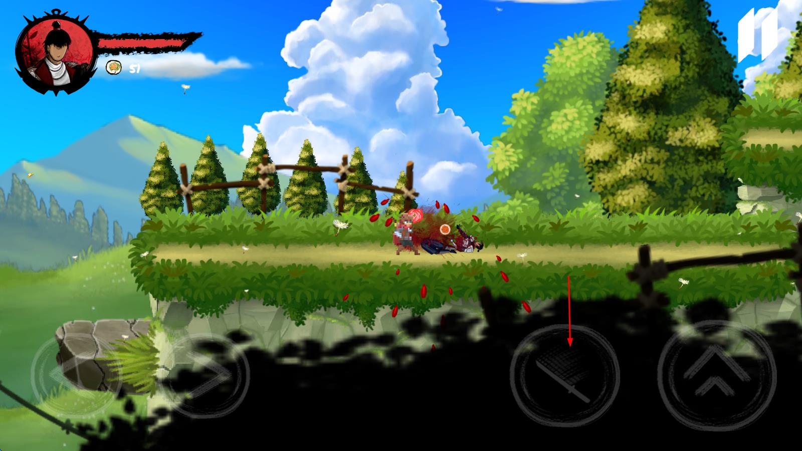 3、遇到敌人时,点击右下角攻击按键,让武士挥刀战斗,击败阻拦的敌人,继续推进冒险进程。