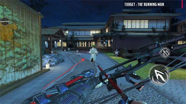 1、瞄准移动的目标奔跑的人,预判其移动轨迹,准备发射弓箭。