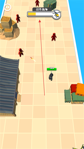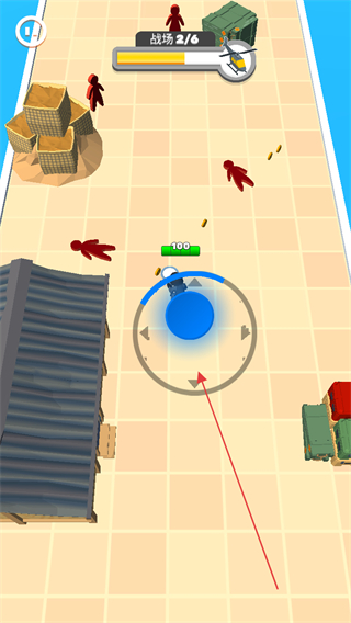 1、操控英雄角色移动,攻击场景中的敌方单位红色小人,推进战场进度。