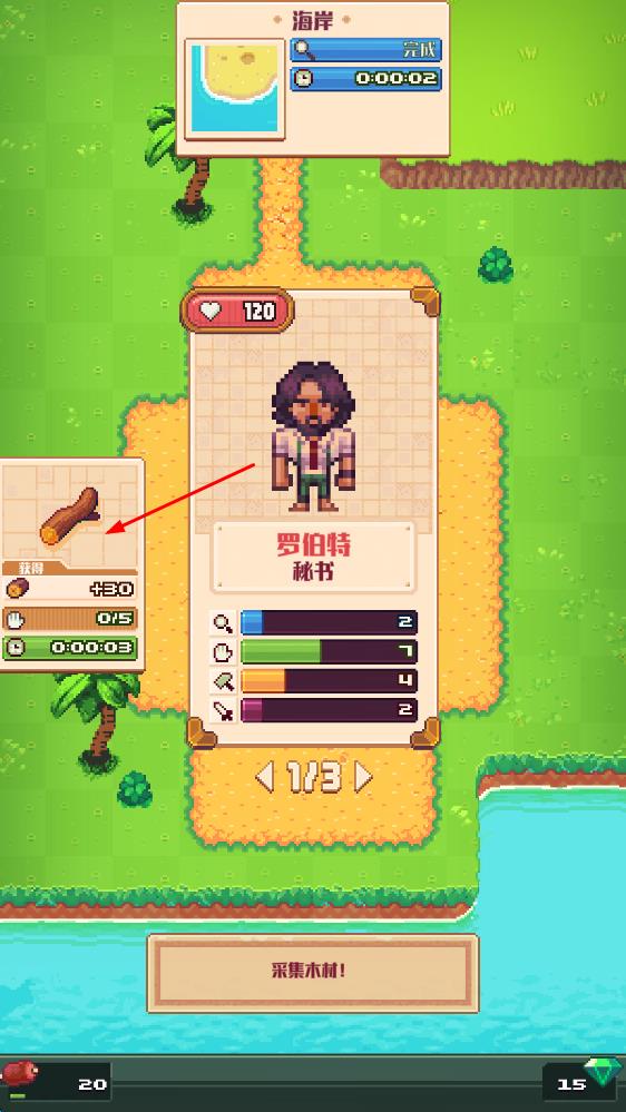 3、切换到海岸场景,界面会显示可采集木材,点击“采集木材!”按钮,罗伯特将进行木材采集,同时可查看左侧获得木材等资源的数量情况 。
