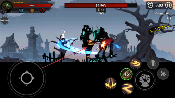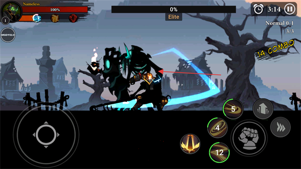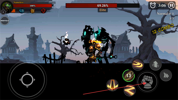 以黑暗色调构建游戏世界,火柴人角色造型凌厉干练,战斗时技能特效炸裂,剑光与暗影交织,每一次出招都极具视觉冲击力,营造沸腾的战斗氛围。