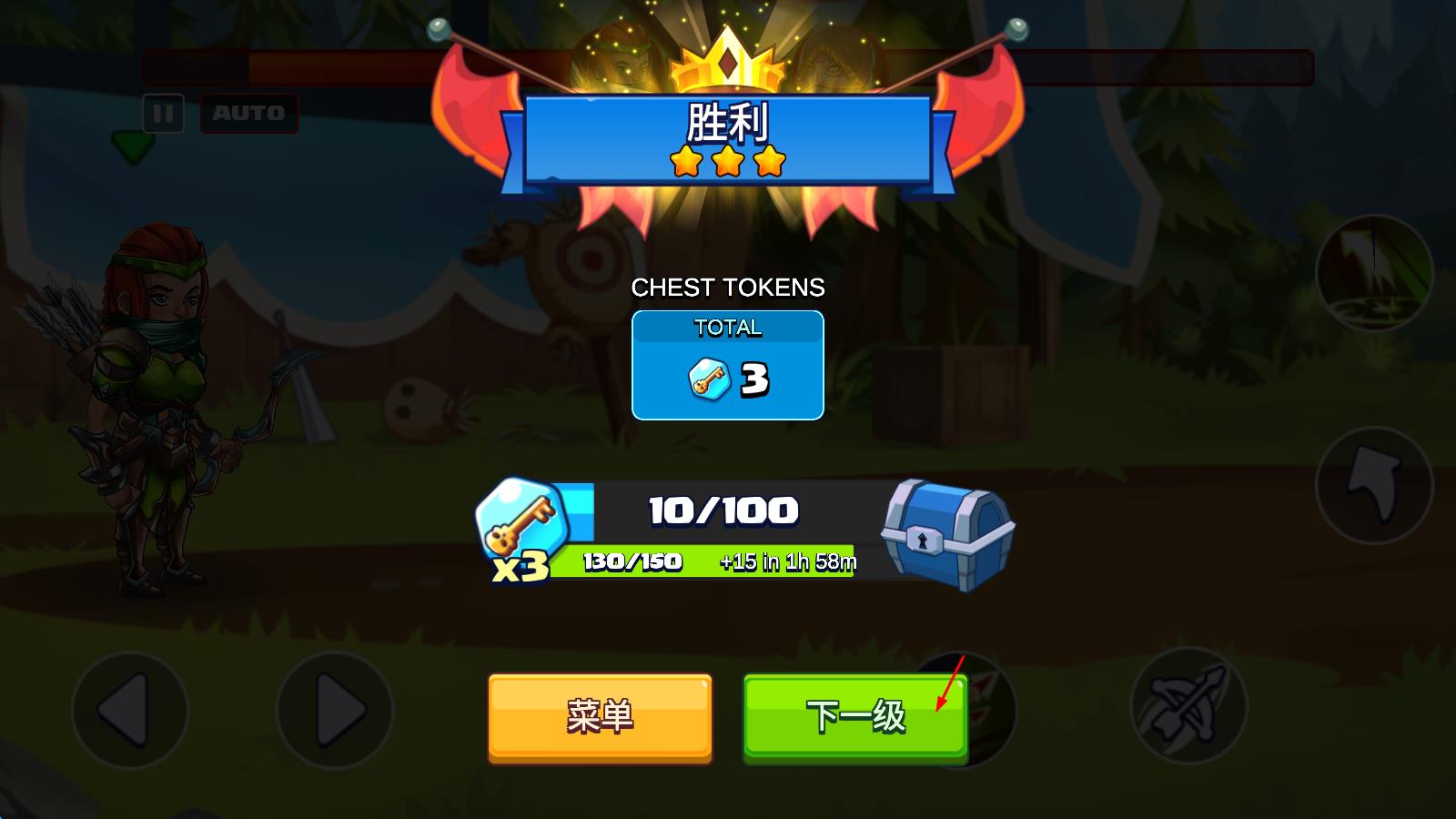 3、战斗胜利后,界面弹出结算页,点击“下一级”,进入新关卡,重复上述操作,持续挑战更强敌人,推进游戏进程 。