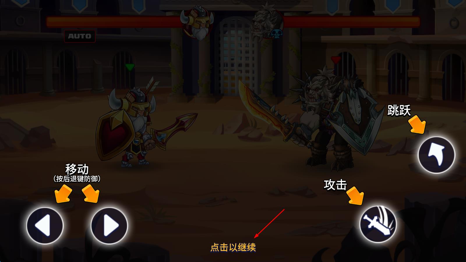 1、进入战斗场景后,点击“点击以继续”,熟悉移动、跳跃、攻击按键功能,根据敌方行动,用移动键调整位置,按后退键可触发防御 。