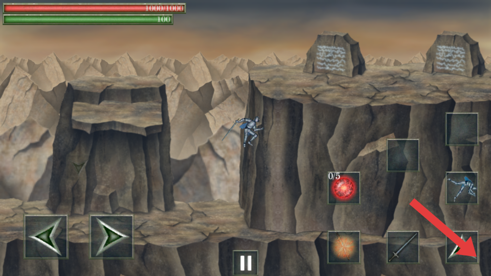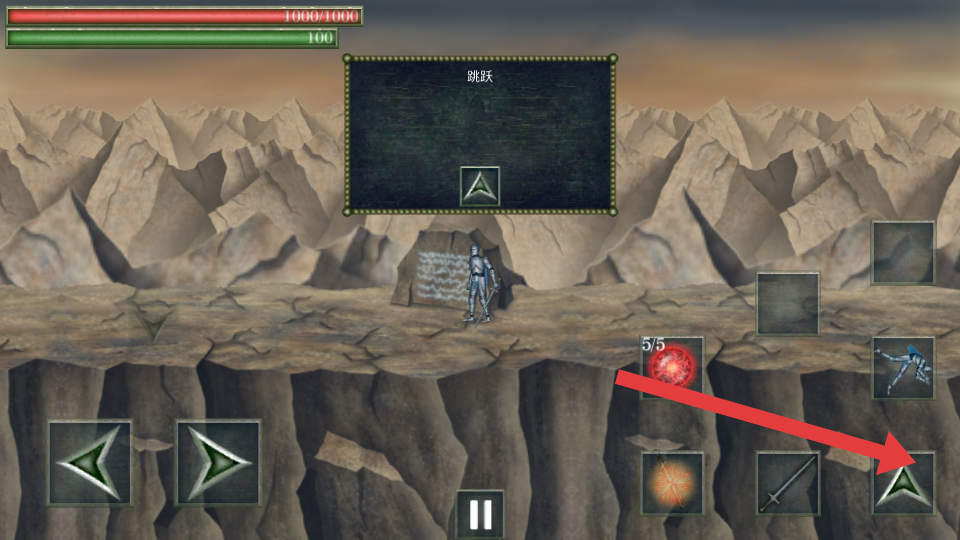 1、在需要跨越地形时,点击箭头指向的跳跃按键,操控角色进行跳跃,可越过悬崖等障碍,到达新的区域。