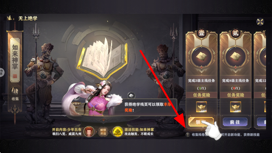 2、无上绝学界面,完成指定主线任务,如3级主线任务等,可点击领取按钮,获取绝学残页等奖励,这些奖励能助力角色学习更强技能。