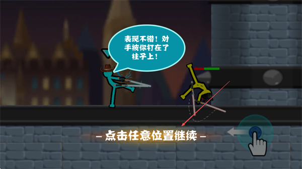 4、击败敌方火柴人后,点击任意位置继续游戏,挑战下一个对手。