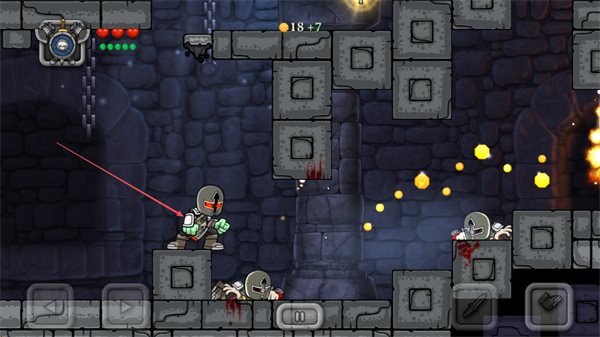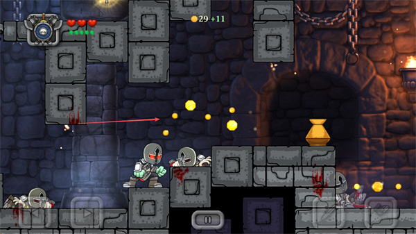 1、操控角色在城堡场景中移动,攻击骷髅类敌人,收集金币。