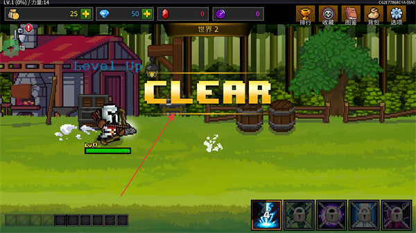 3、击败敌人后,场景出现CLEAR提示,完成关卡,解锁新场景如世界2。