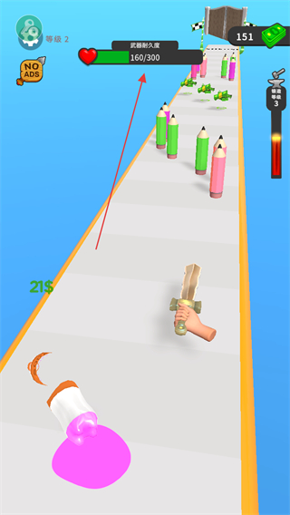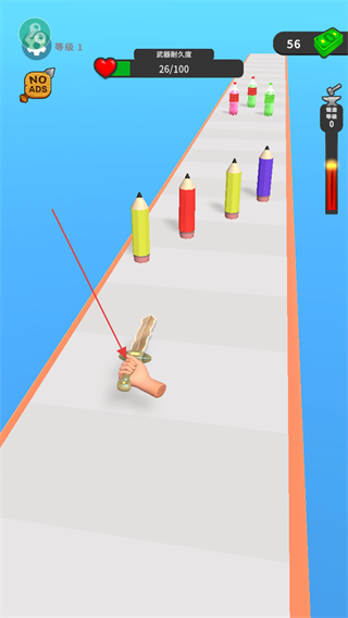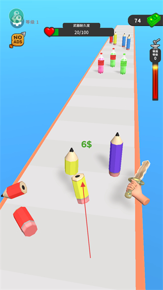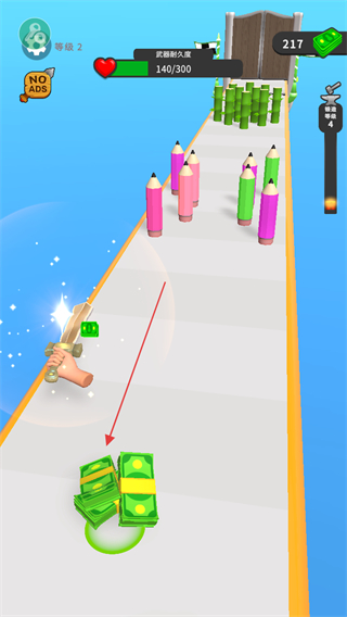 1、在跑道上操控武器如剑,切割彩色铅笔等物体,获取金币奖励。