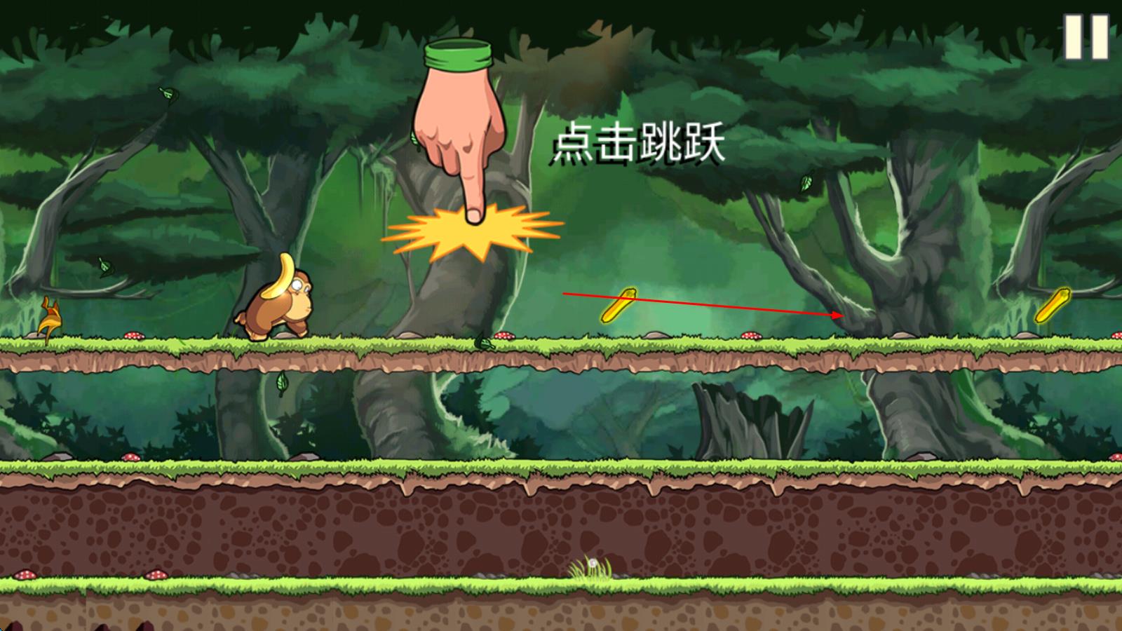 游戏的主角是一只呆头呆脑的肥猩猩,看见香蕉就毫无节制的狂吃,直到那堆积如山的香蕉皮铺天开地如排山倒海般汹涌而至,贪嘴的肥猩猩顿时傻了眼。怎么办?跑啊!在游戏中,肥猩猩不但要避免被身后的香蕉皮大军淹没,还要躲避逃亡道路上的种种障碍,木球、石柱、水潭等等,一不小心跌入这些陷阱可就Game Over了。要想顺利的躲避这一切,将这场逃亡之路行的更长更远就要看玩家的反应与操控了。游戏共有4种单指操作,分别是点击跳跃,下划下滚,长按滑翔以及右划加速,玩家控制我们的主角肥猩猩上蹿下跳滑行打滚,在不同的动作间切换时非常流畅毫无卡顿,手感非常好。