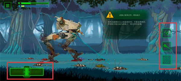 2、进入战斗场景后,拖动左侧拉杆调整射程,点击武器按钮进行攻击。