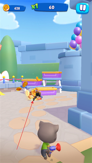 1、操控汤姆猫在公园场景移动,瞄准目标发射道具,击碎障碍物。