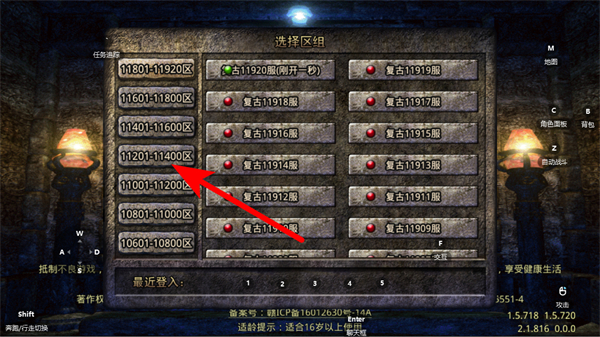 2、在选择区组页面,点击左侧的区组分类,如11201-11400区。