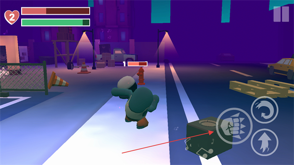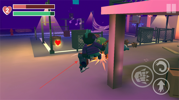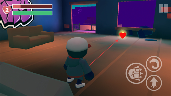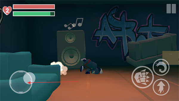 1、用左侧虚拟摇杆控制角色移动,右侧拳头图标攻击,在房间内破坏音响等物品,推进游戏。