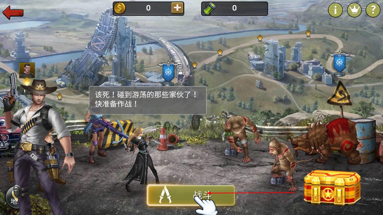 1、进入游戏地图界面,遇到游荡怪物后,点击下方“战斗”按钮,触发战斗场景,角色自动进入战斗准备状态。